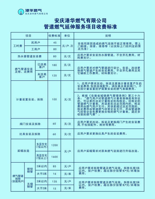 安慶市管道燃?xì)庋由旆?wù)項(xiàng)目及主要收費(fèi)標(biāo)準(zhǔn)