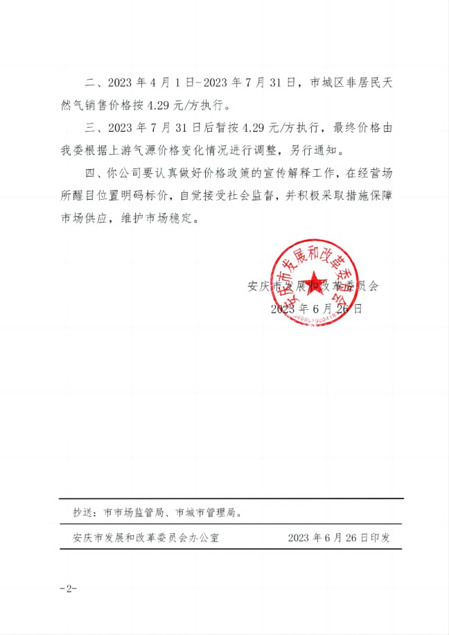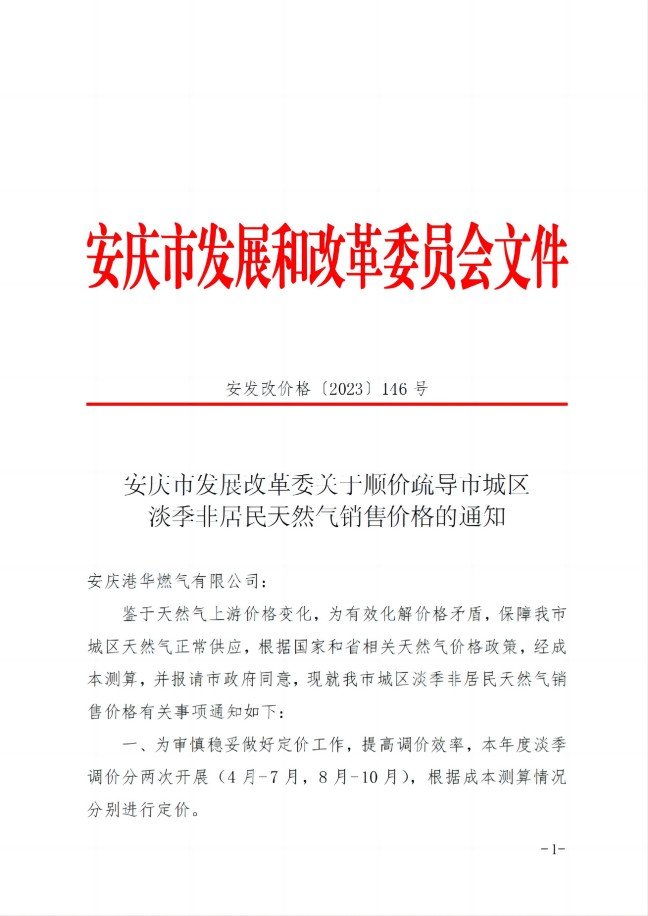 安慶市發(fā)展改革委關于順價疏導市城區(qū)淡季非居民天然氣銷售價(2023)格的通知