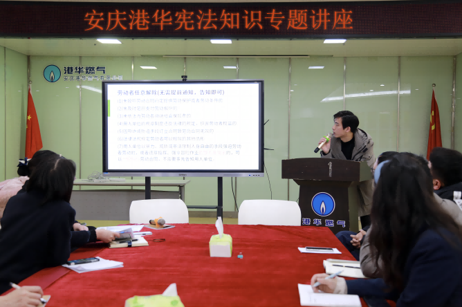 組織20余名員工代表開展憲法專題講座,以《中華人民共和國憲法》《勞動法》《城鎮(zhèn)燃?xì)夤芾項l例》及誠信合規(guī)相關(guān)法律法規(guī)的解讀和案例詳解為主要內(nèi)容,進行法律宣講。