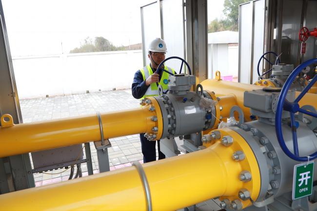 12時(shí)08分,置換作業(yè)開始。確定管道內(nèi)氣體成分比例符合要求后,置換組緩慢開啟1號(hào)閥門,向管網(wǎng)內(nèi)輸送天然氣,并由調(diào)度中心對管網(wǎng)內(nèi)壓力情況跟進(jìn)、監(jiān)測。正午時(shí)分,驕陽似火,檢測人員們一邊吃著盒飯一邊堅(jiān)守施工現(xiàn)場觀測數(shù)據(jù)。終于,14時(shí)16分,現(xiàn)場調(diào)度的對講機(jī)內(nèi)傳來放散塔檢測人員的聲音:“經(jīng)檢測,管網(wǎng)內(nèi)燃?xì)夂恳堰_(dá)99.7%,置換合格?!?