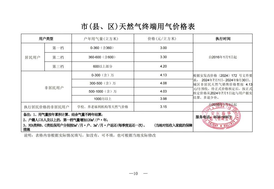市(縣、區(qū))天然氣終端用氣價格表(2024)