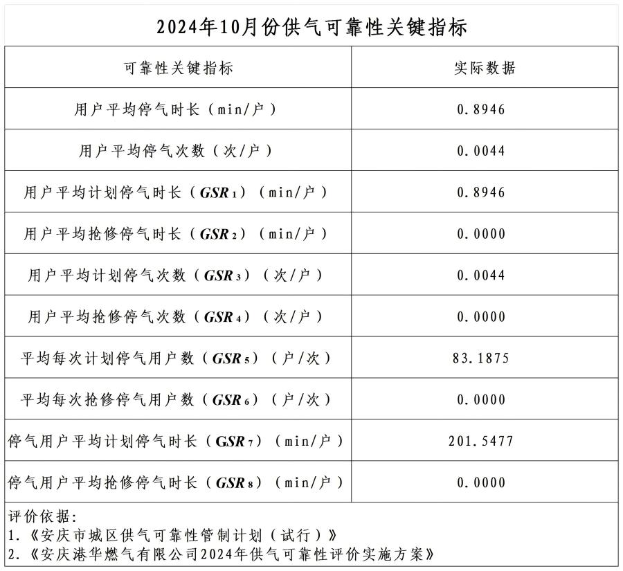 2024年10月份供氣可靠性關(guān)鍵指標(biāo)