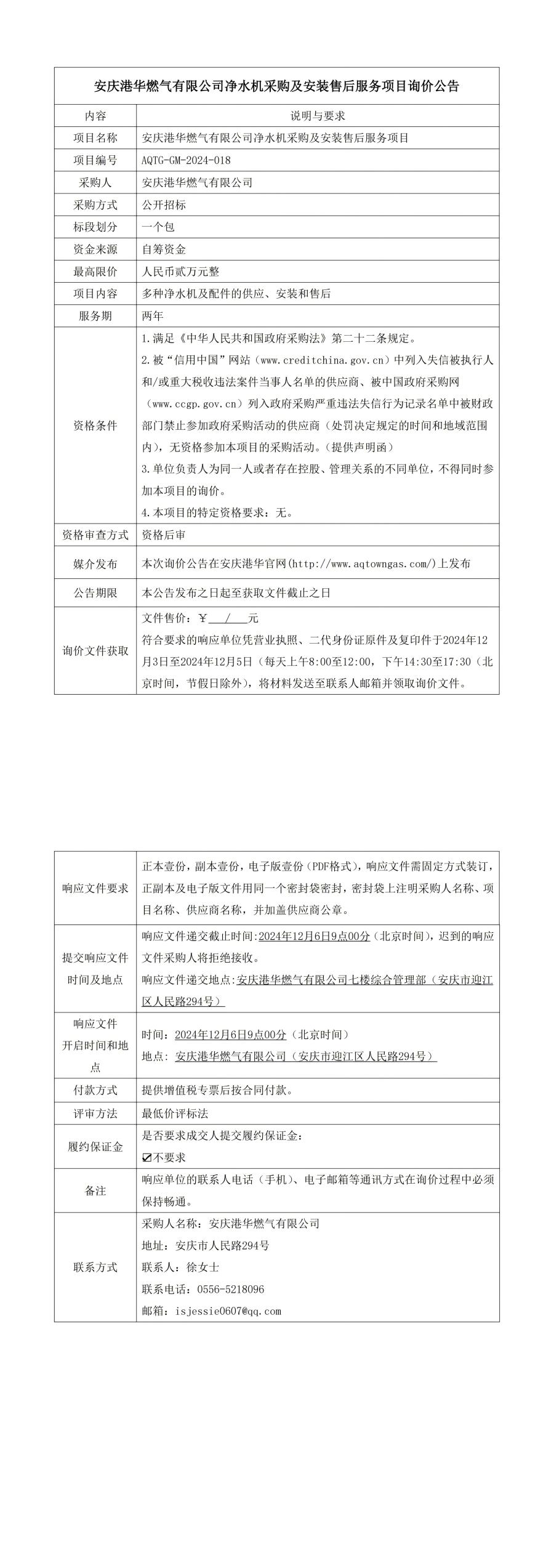 安慶港華燃?xì)庥邢薰緝羲畽C(jī)采購及安裝售后服務(wù)項(xiàng)目詢價(jià)公告
