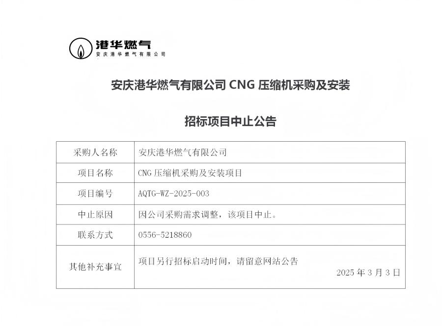安慶港華燃氣有限公司CNG壓縮機采購及安裝招標(biāo)項目中止公告