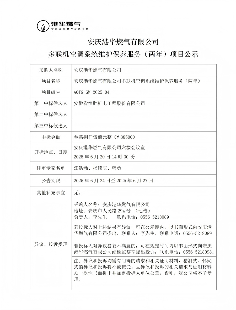 安慶港華燃氣有限公司多聯(lián)機空調(diào)系統(tǒng)維護保養(yǎng)服務(wù)(兩年)項目公示
