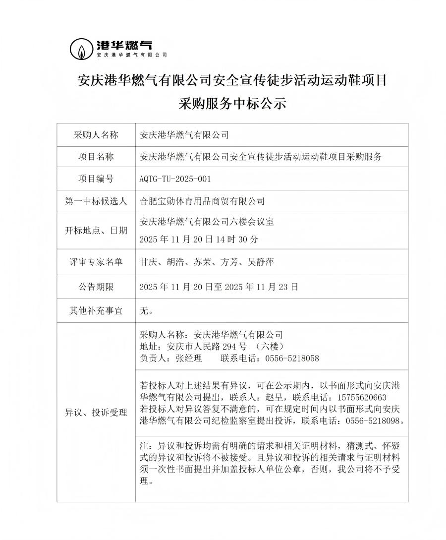 安慶港華燃氣有限公司安全宣傳徒步活動運動鞋項目采購服務(wù)中標公示