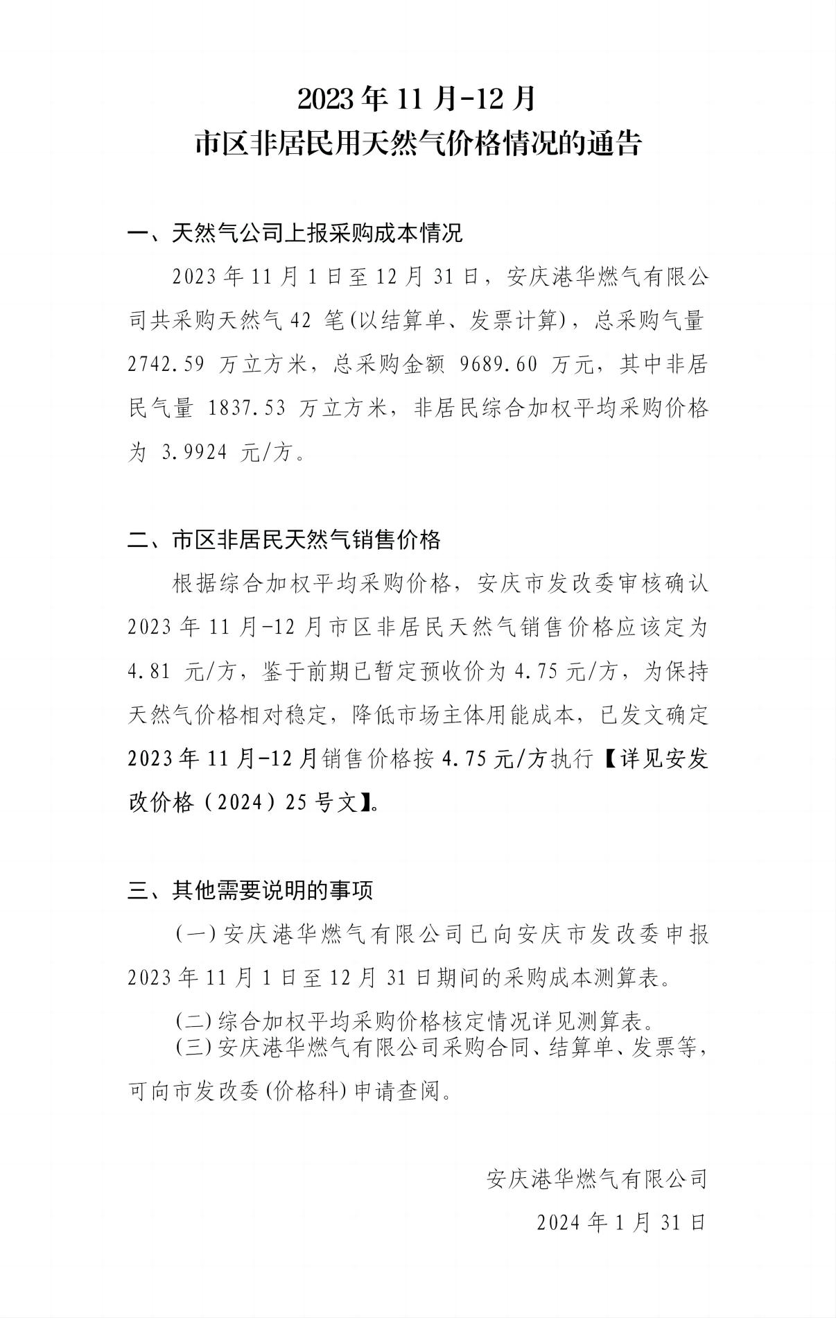 關(guān)于明確安慶市區(qū)2023年第四季度天然氣價(jià)格和2024年第一季度非居民天然氣暫定價(jià)格有關(guān)事項(xiàng)的通知